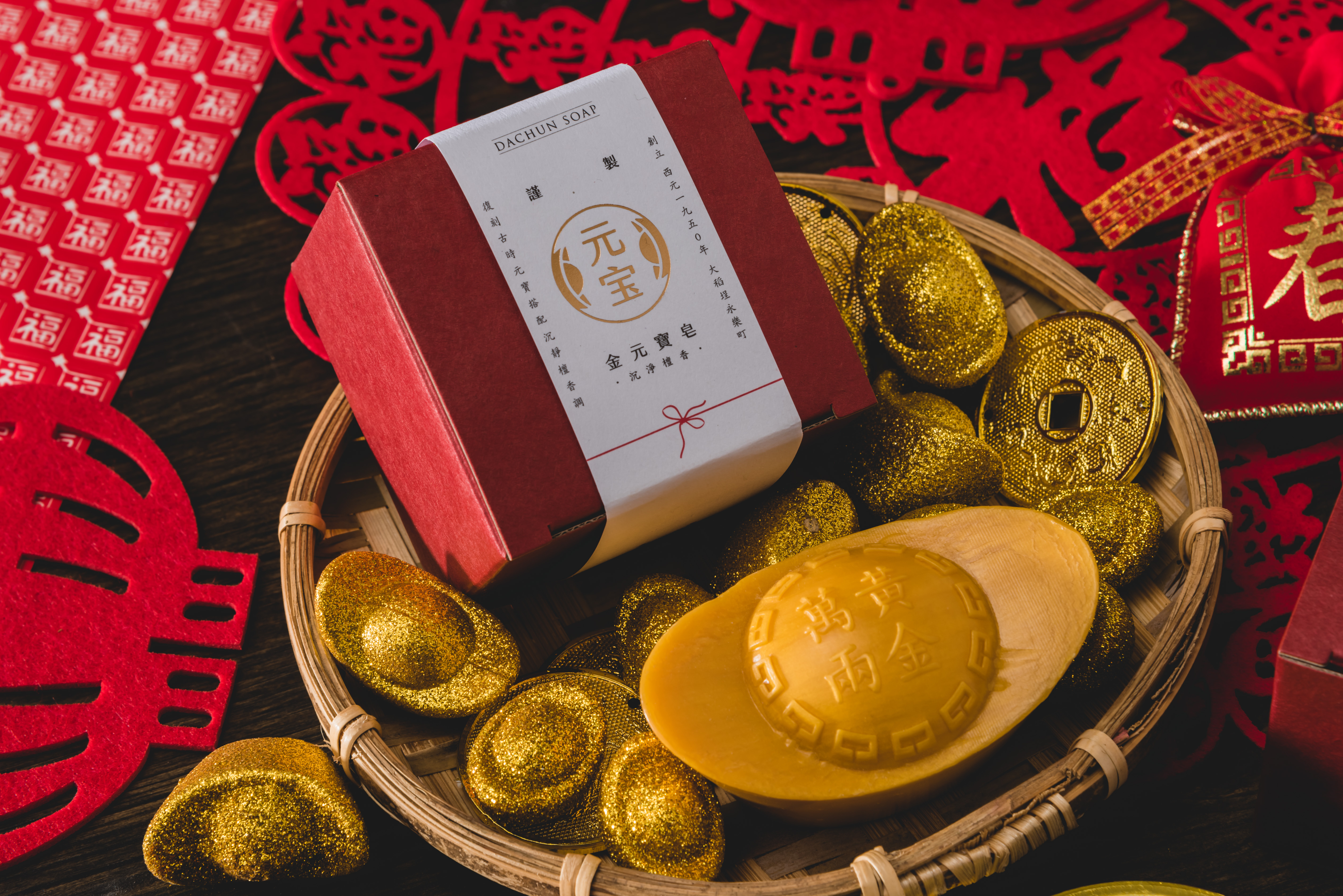 The soap is modeled from ancient gold ingots, printed with the text, Wan Liang Huang Jin (meaning "millions' worth of gold" in Chinese) for its auspicious symbol to attract bundles of wealth.