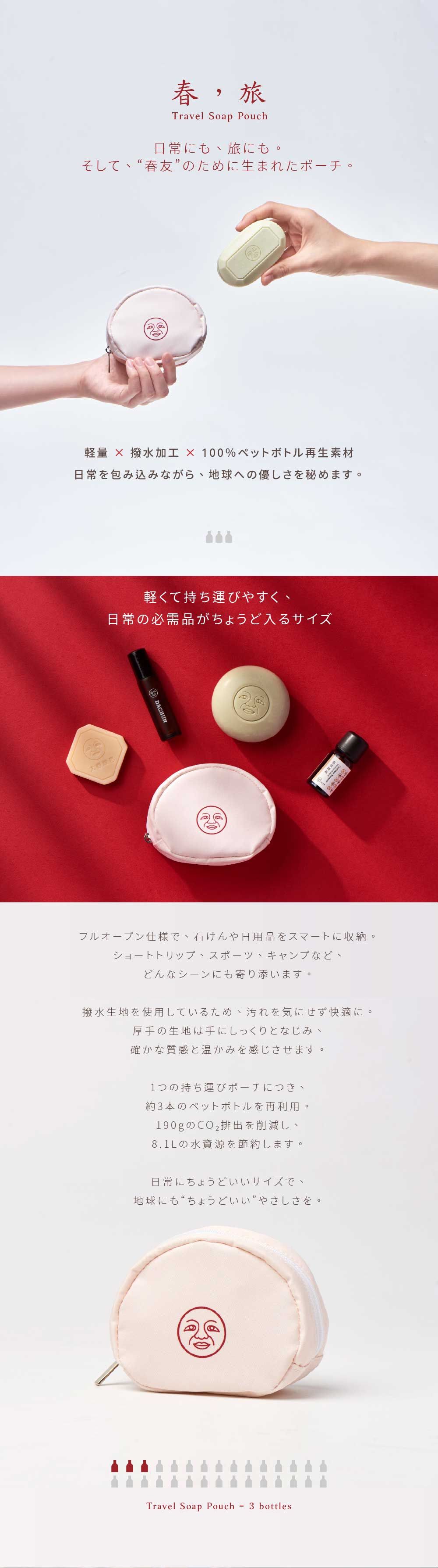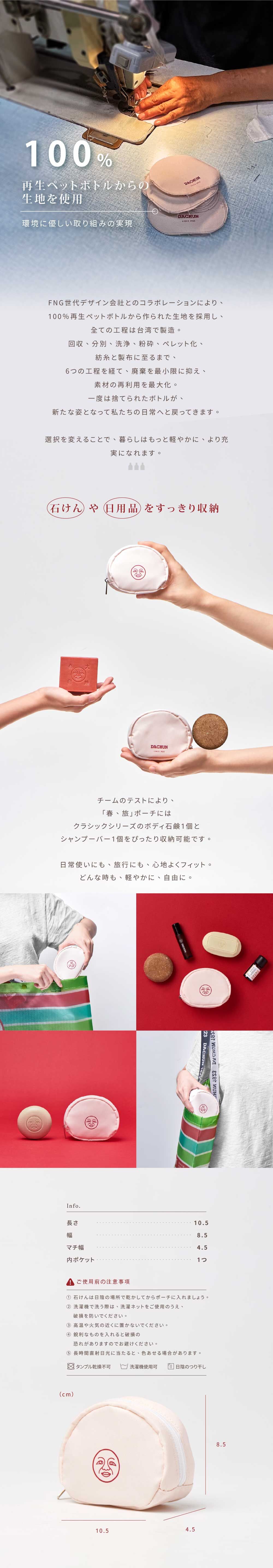* 1つのポーチにつき、約3本のペットボトルを再利用し、190gのCO₂排出を削減と8.1Lの水資源を節約