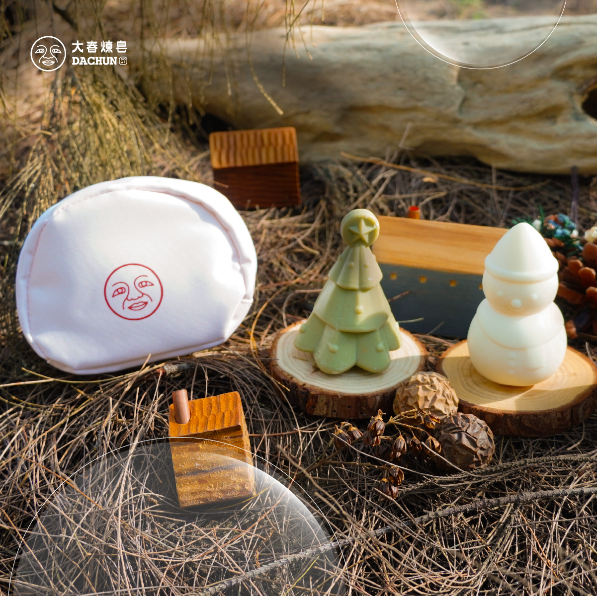 | ギフトボックスには:「希望の森石けん」「 心温まるスノーマン石けん」「春、旅.石けん持ち運びポーチ」各1個入り、大春煉皂オリジナル紙袋付き |