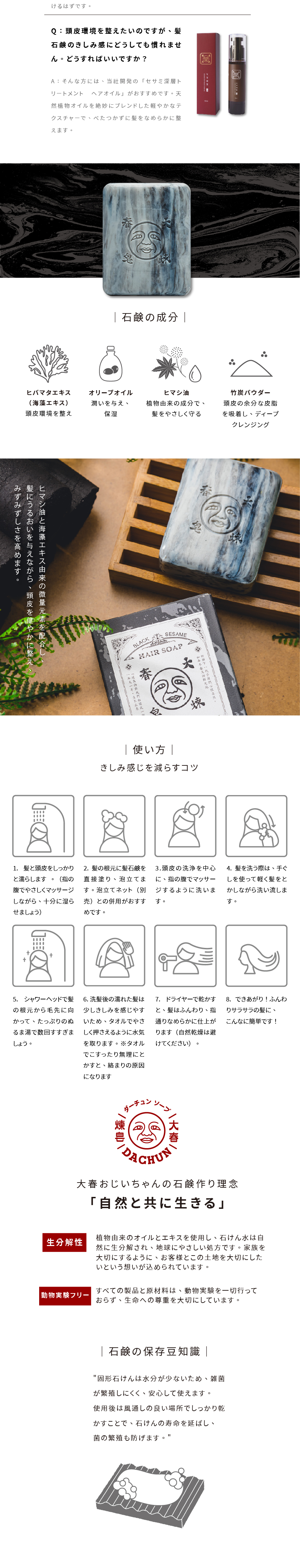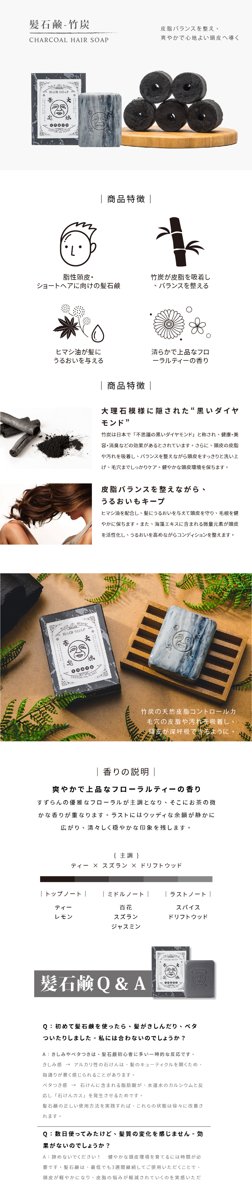 | 主成分:パーム油、パーム核油、ヒマシ油、竹炭パウダー、オリーブ油、ヒバマタエキス(海藻エキス) |