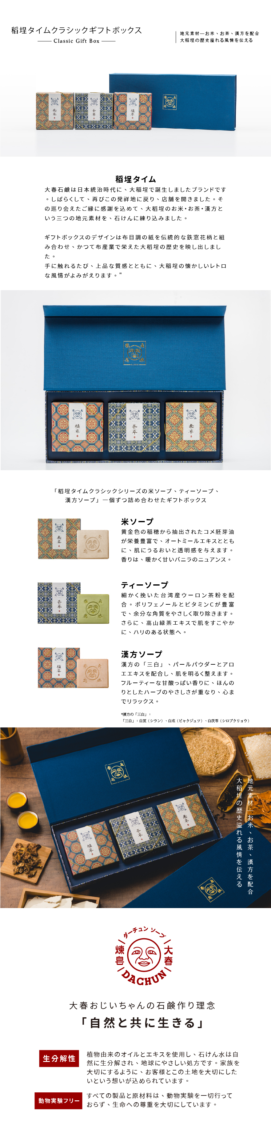 | ギフトボックスには:米ソープ、ティーソープ、漢方ソープ |