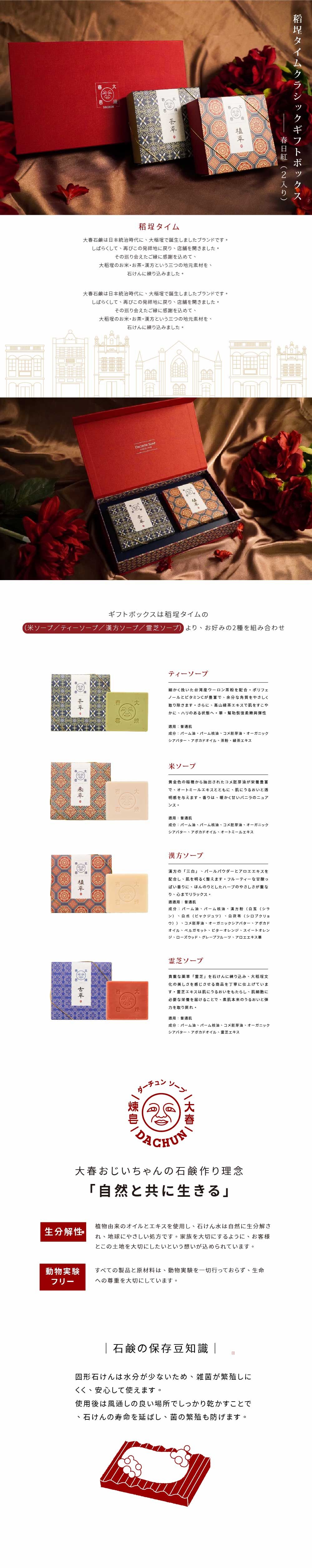 ギフトボックス中身:(米ソープ/ティーソープ/漢方ソープ/霊芝ソープ)より2種を選択
