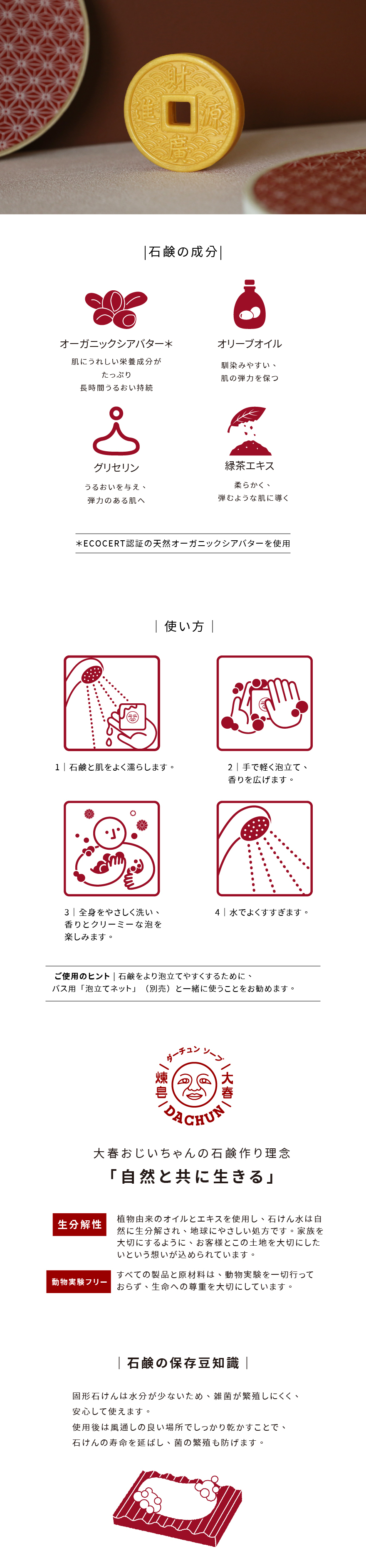 | 主成分:パーム油、パーム核油、グリセリン、ホホバエステル、シアバター、オリーブ油、緑茶エキス |