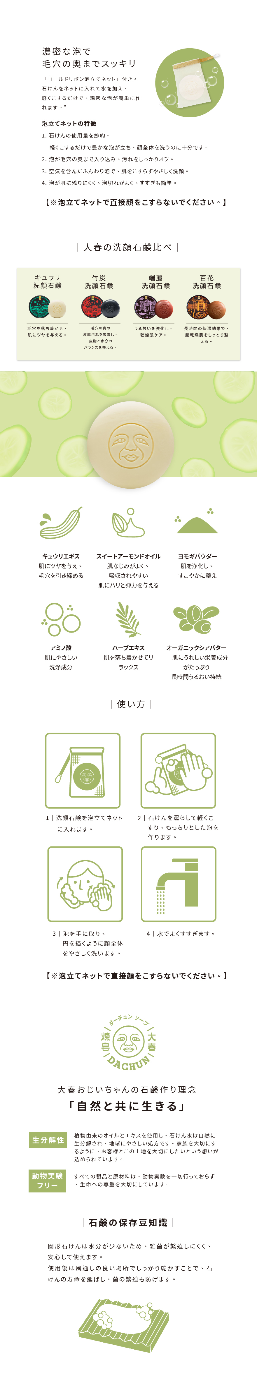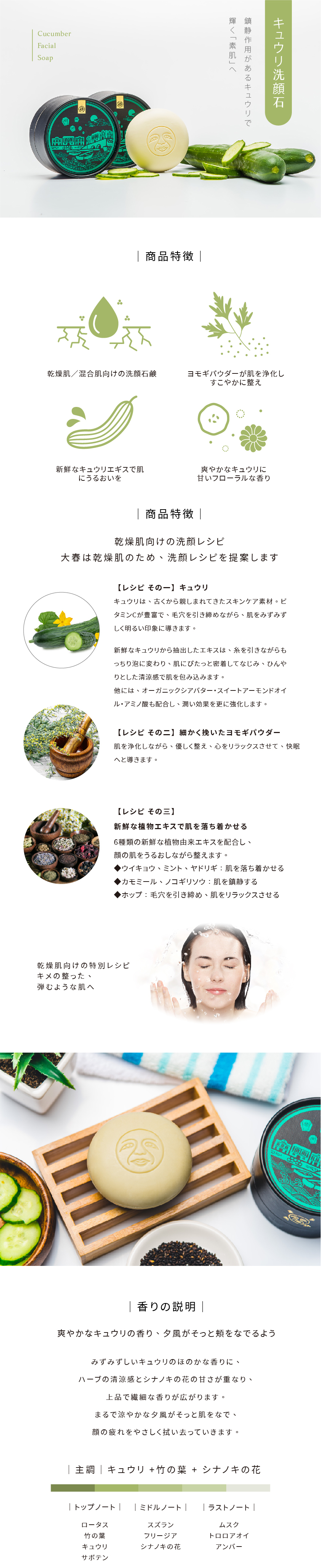 | 主成分:パーム油、パーム核油、アミノ酸、オーガニックシアバター、スイートアーモンド油、ヨモギパウダー、キュウリエキス、ハーブ植物エキス |