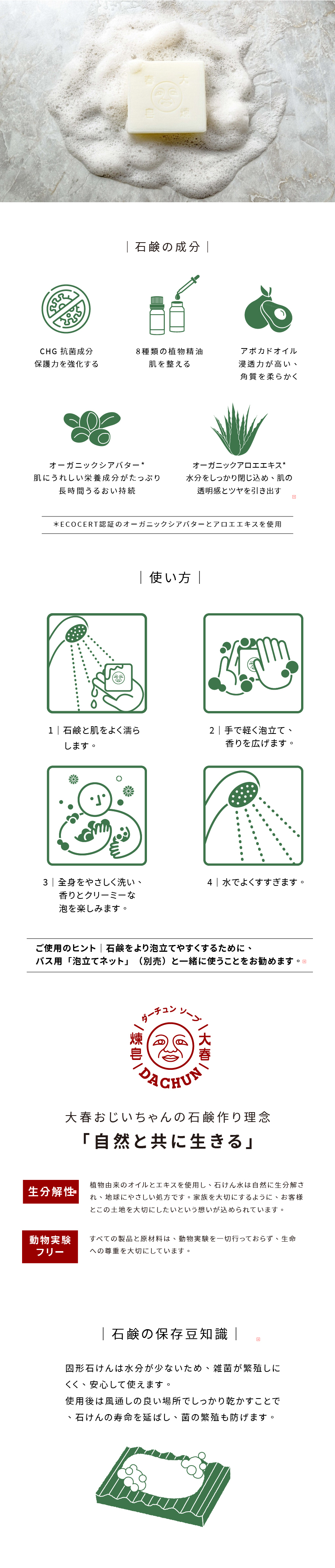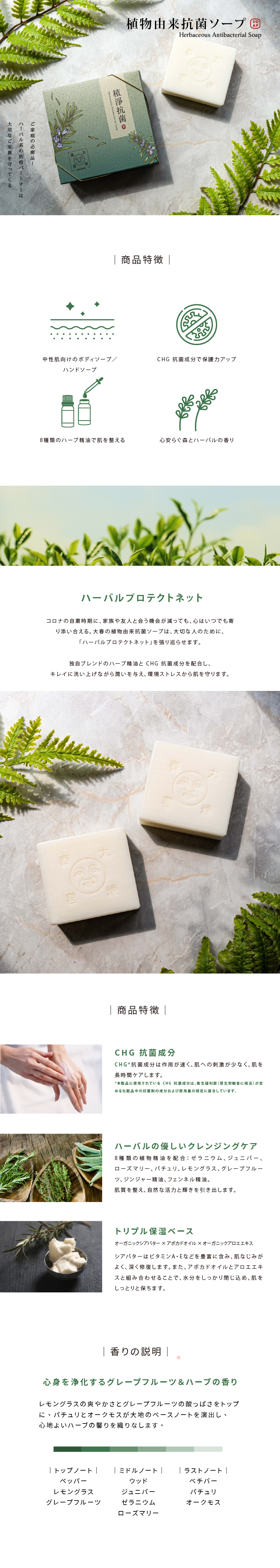 • 6 種のハーブ精油をブレンド。肌質をバランスよく整えながら、 森とハーバルの心安らぐ香りが広がります