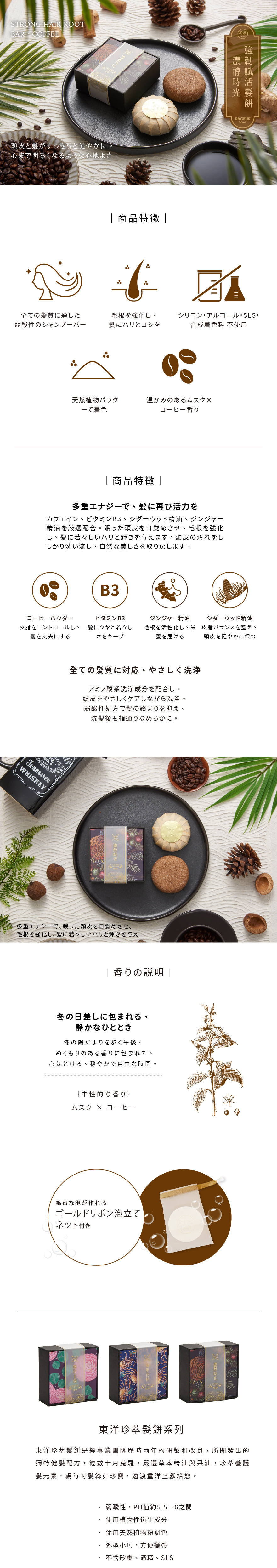 • カフェイン、ビタミンB3、シダーウッド精油、ジンジャー精油などを厳選配合。毛根を健やかに整え、活力のある髪へ