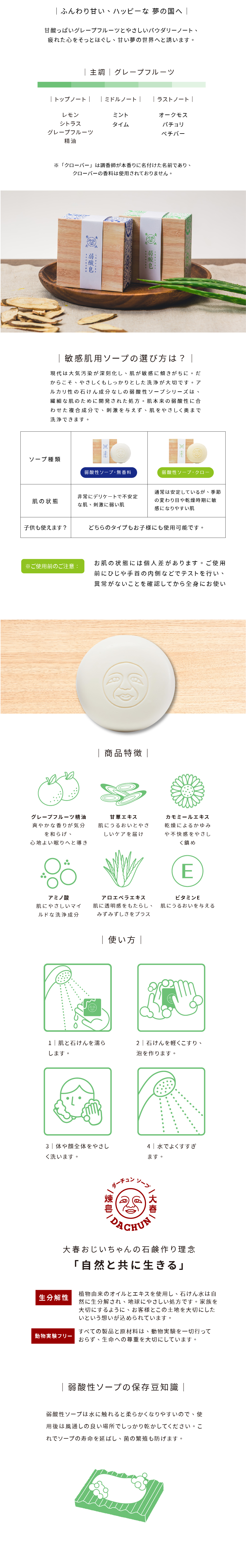 | 主成分:アミノ酸、ビタミンE、甘草エキス、グレープフルーツ精油、カモミールエキス、アロエエキス |