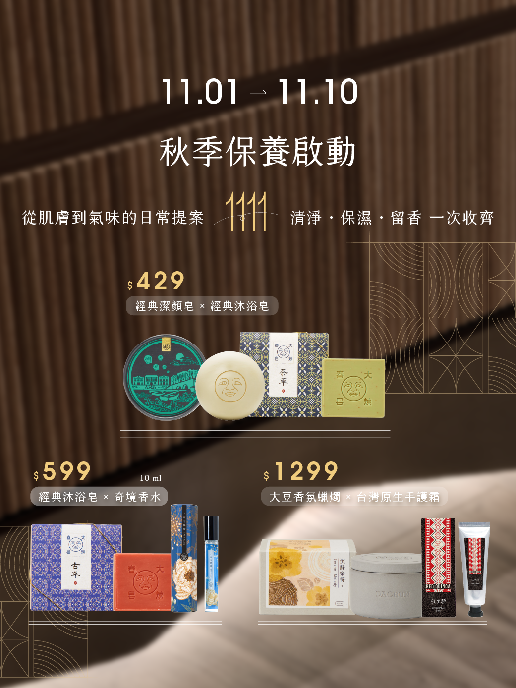 雙十一感謝祭限定【$429 雙皂清潔組】:活動期間任選經典沐浴皂以及熱銷潔顏皂各一款,享組合優惠價429元 (原價值530元)