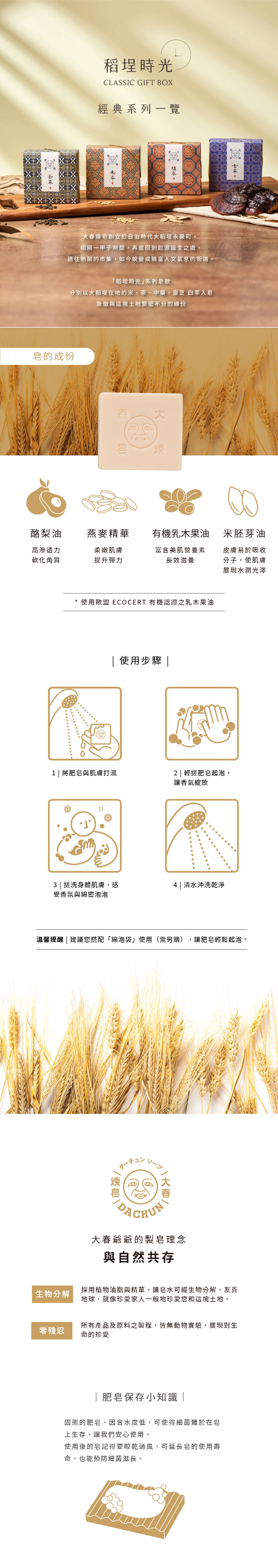 • 以大稻埕在地材料入皂,自金黃稻穗中萃取的米胚芽油,富含營養素,滋潤鎖水