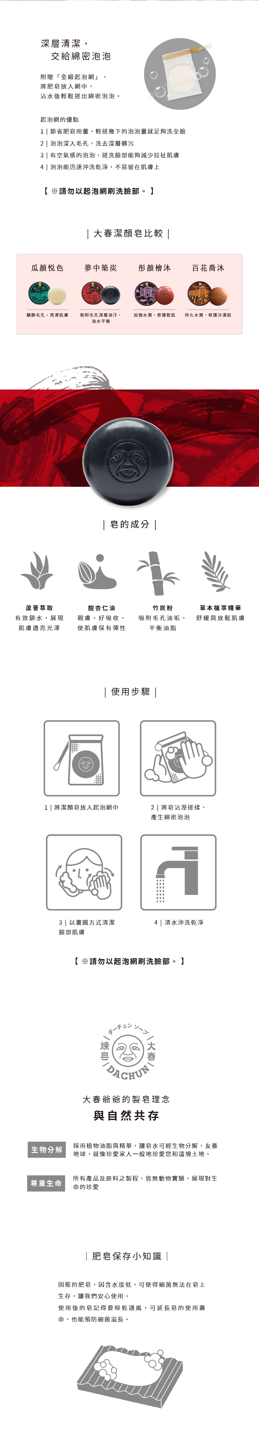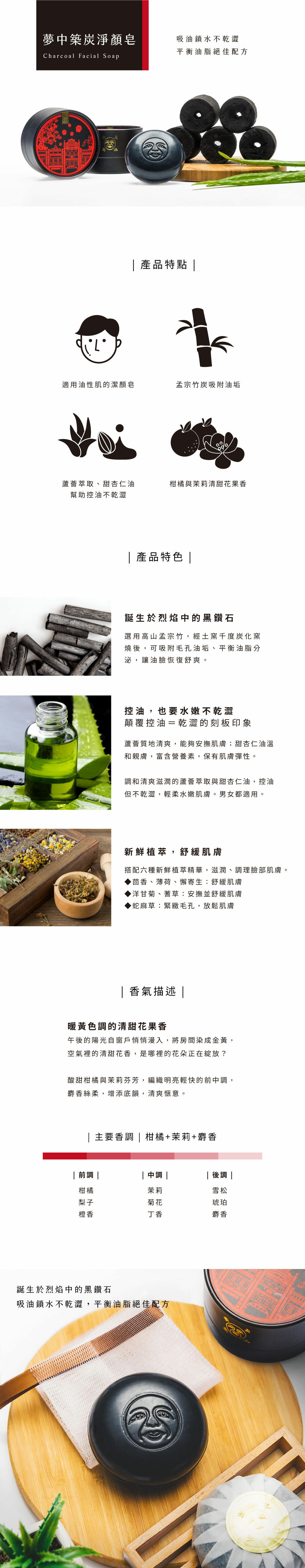 成分:棕櫚油、棕櫚核仁油、竹炭粉、酪梨油、甜杏仁油、草本植萃精華、蘆薈萃取