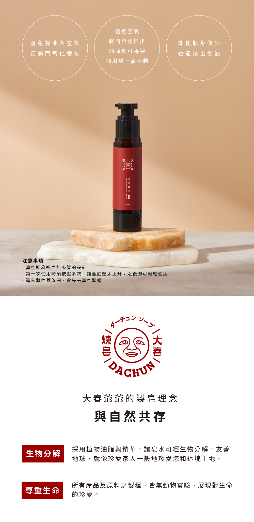 使用方法:乾、濕髮時皆可使用,無需沖洗。取適量髮油,塗抹於頭髮中段至尾端,並吹乾頭髮。