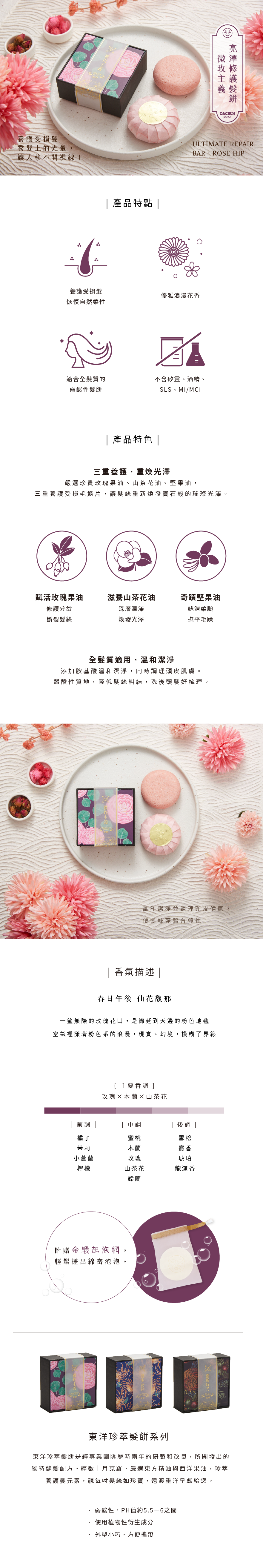• 嚴選玫瑰果油、山茶花油、堅果油,養護受損髮絲