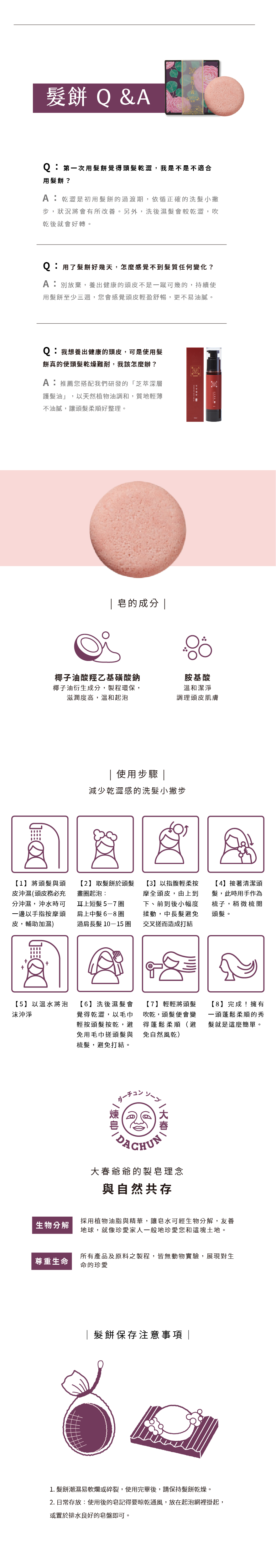 • 適合全髮質的弱酸性髮餅,給予頭皮零負擔
